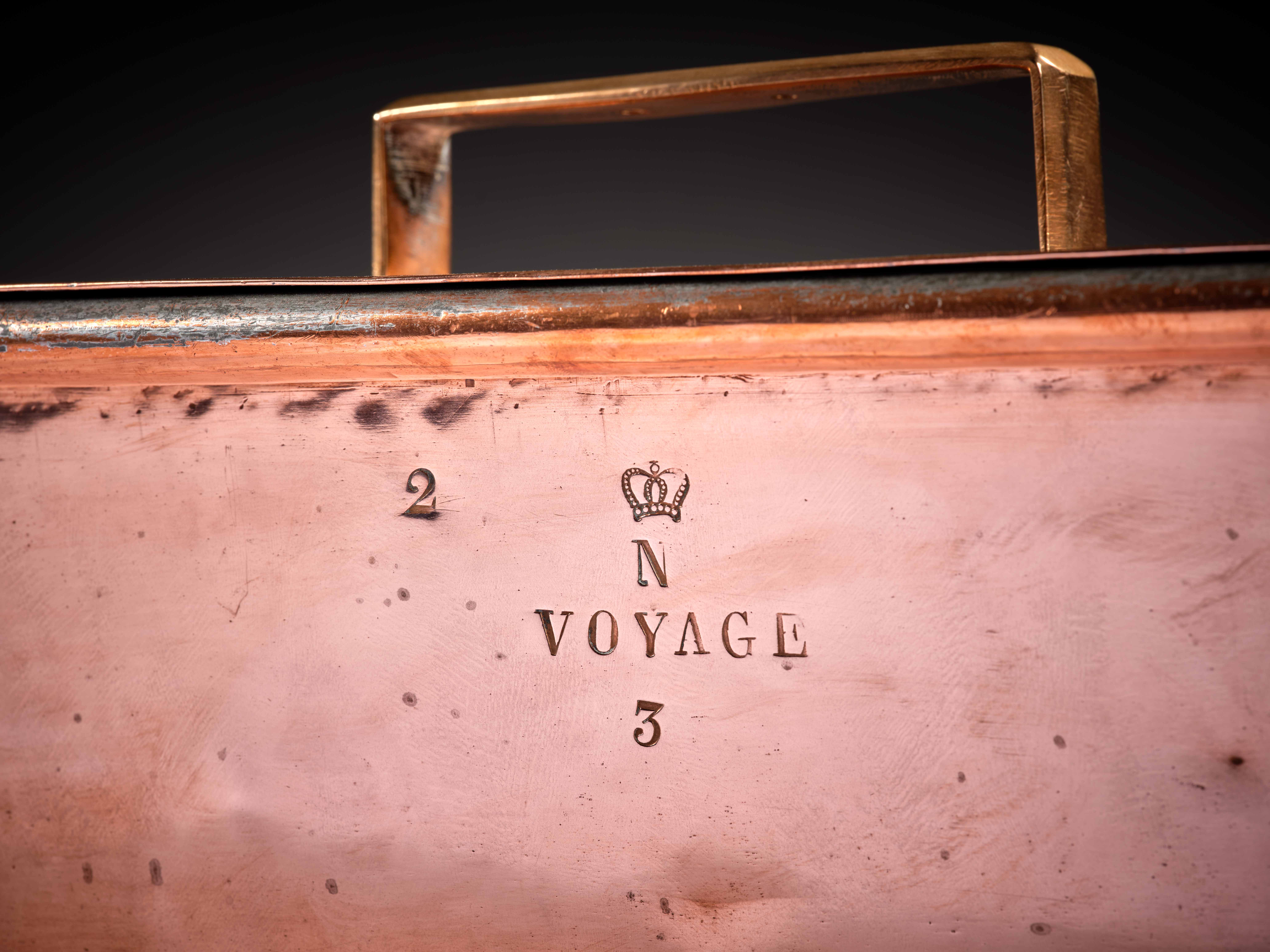 Couvercle à poignée en cuivre sur embase rivetée poinçonné du chiffre « N » sous couronne impériale, de la mention « VOYAGE » et des chiffres « 1 » et « 2 »